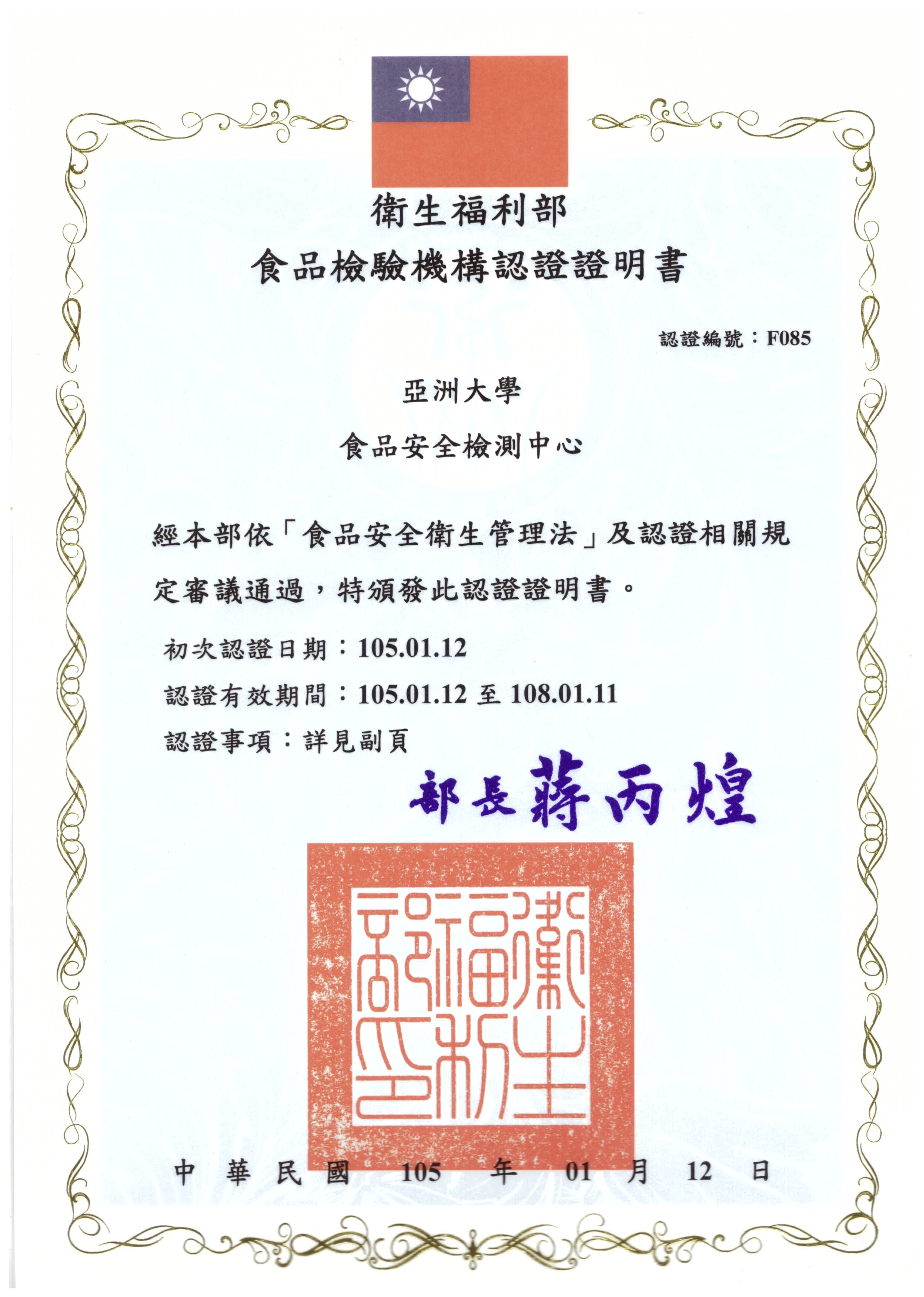 Asia University's Food Safety and Inspection Center has been certified for operation. The Food Safety and Inspection Center has been certified by TFDA for checking animal-derived ingredients in food.