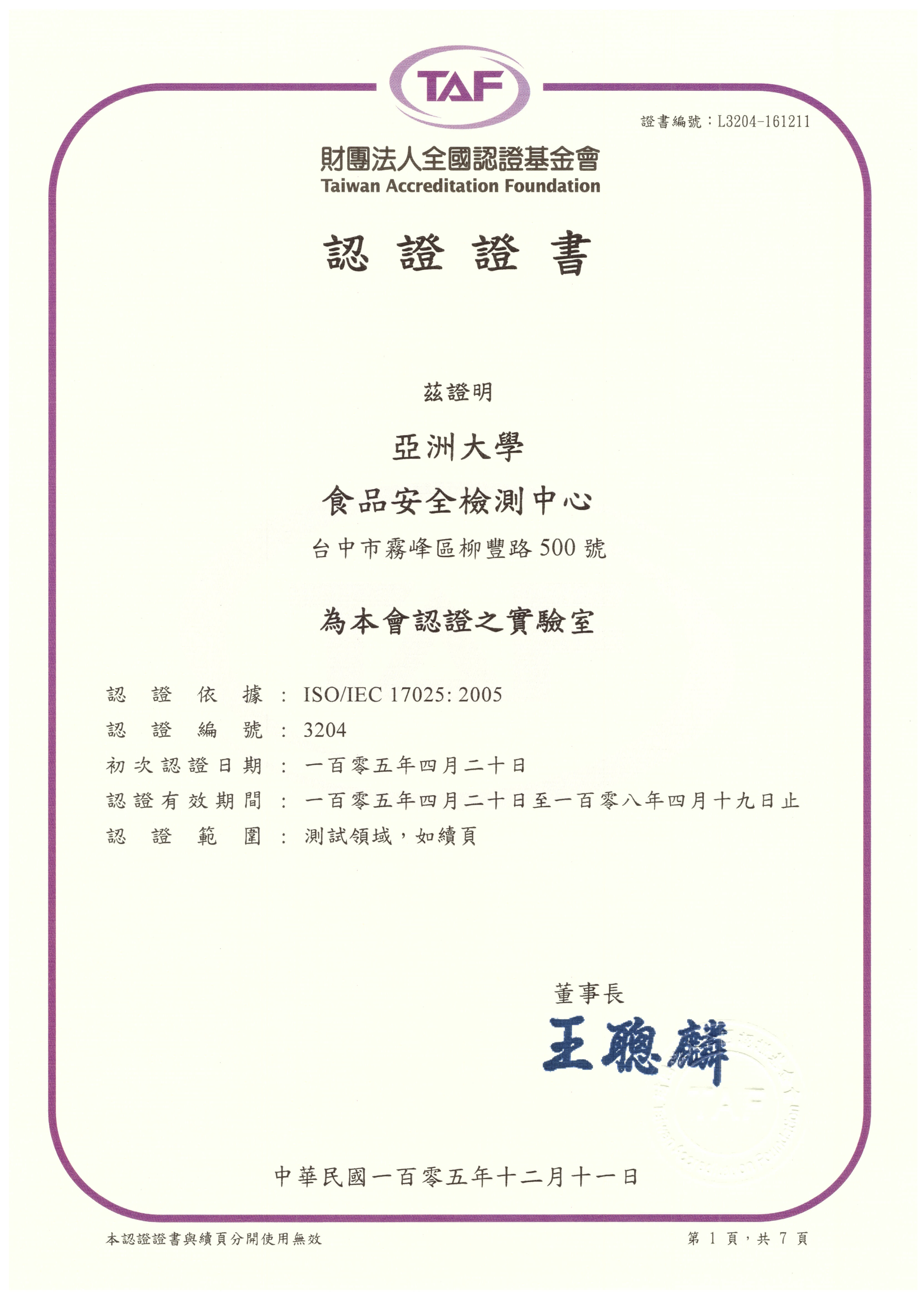 基因改造食品對於健康影響頗具爭議的同時,我國食品安全衛生管理法對於基改食品的管理已正式上路,包含強制標示及禁入校園等政策,但食品產業對於基改食品的自主管理有技術及專業知識上的雙重困難。亞洲大學食品安全檢測中心繼去 (105) 年通過衛生福利部食品藥物管理署 (TFDA),及全國認證基金會 (TAF) 認證實驗室,再度以專業之能力及技術通過以國際方法檢驗基改黃豆成分之TAF 認證,成為全國唯一具有國家及國際方法檢驗基改食品之認證專業檢驗中心,此外,同時亦獲得食品微生物及植物性成分檢驗認證,利用專業先進的儀器設備及技術,提供食品業者及社會大眾食品安全檢測服務,目前已有廠商及政府單位委託檢驗。